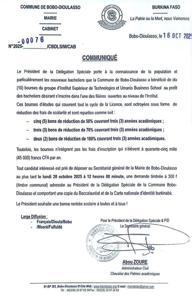 Le Président de la Délégation spéciale de la commune de Bobo-Dioulasso informe les nouveaux bacheliers que la ville a bénéficié de dix (10) bourses d’études offertes par le Groupe Institut Supérieur de Technologies (IST) et Umanis Business School. Ces bourses sont destinées aux jeunes diplômés du baccalauréat désireux de poursuivre leurs études dans l’une des filières proposées par ces établissements partenaires.