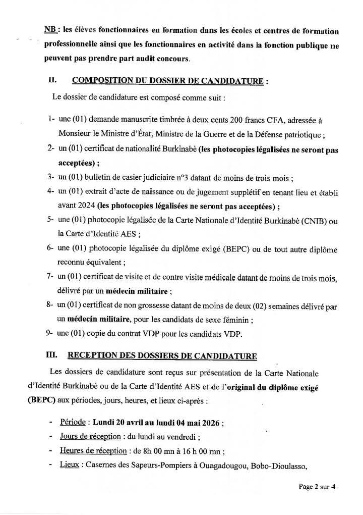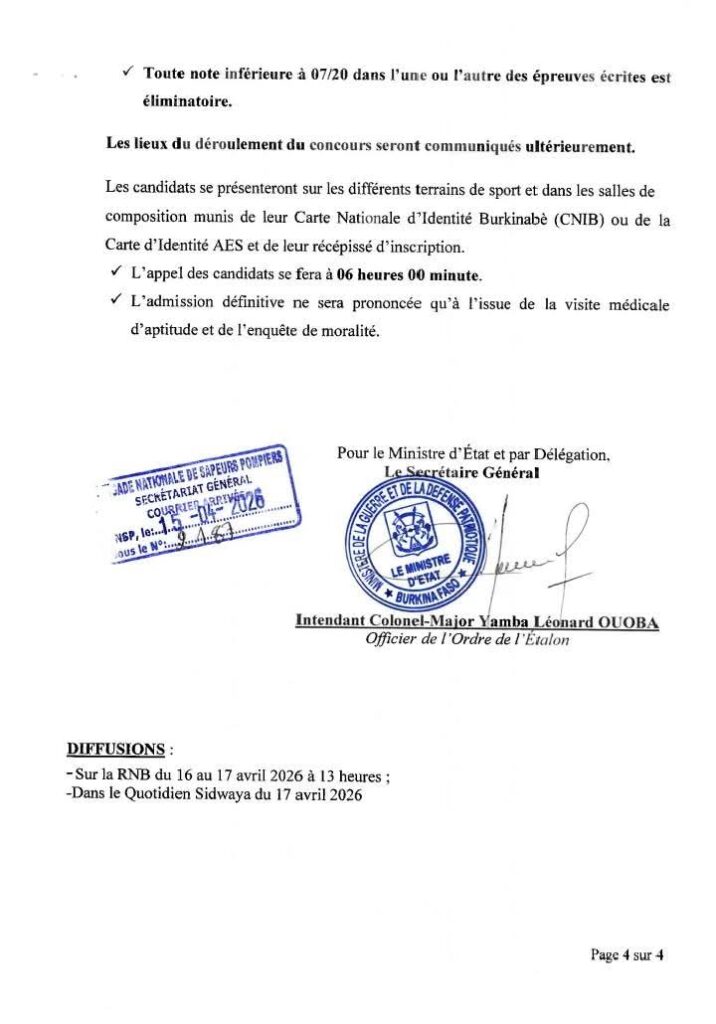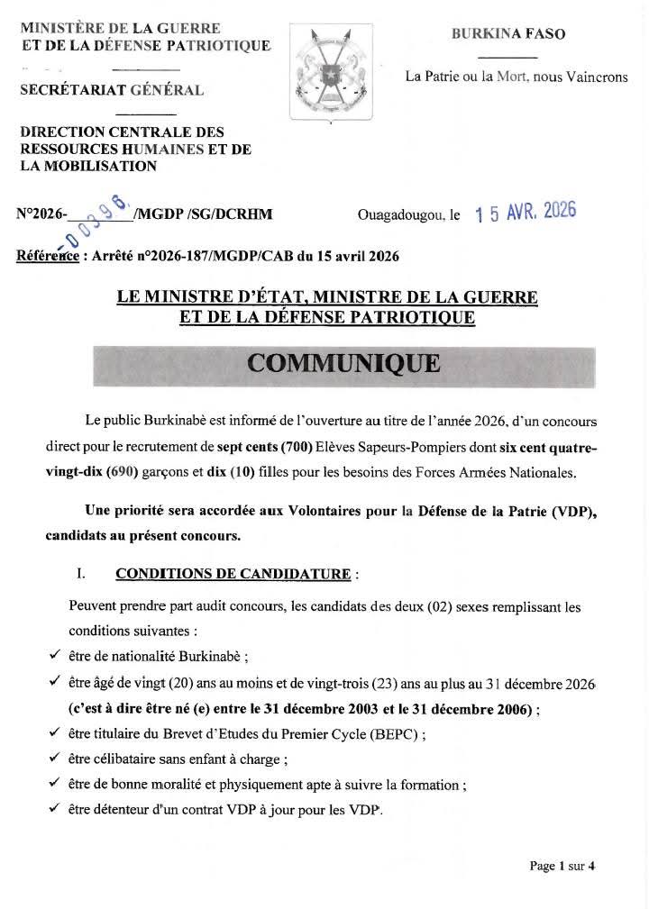 Le public burkinabè est informé de l’ouverture, au titre de l’année 2026, d’un concours direct pour le recrutement de sept cents (700) élèves Sapeurs-Pompiers au profit des Forces armées nationales. Ce recrutement concerne six cent quatre-vingt-dix (690) garçons et dix (10) filles. Selon l’annonce officielle, une priorité sera accordée aux Volontaires pour la Défense de la Patrie (VDP) candidats à ce concours.