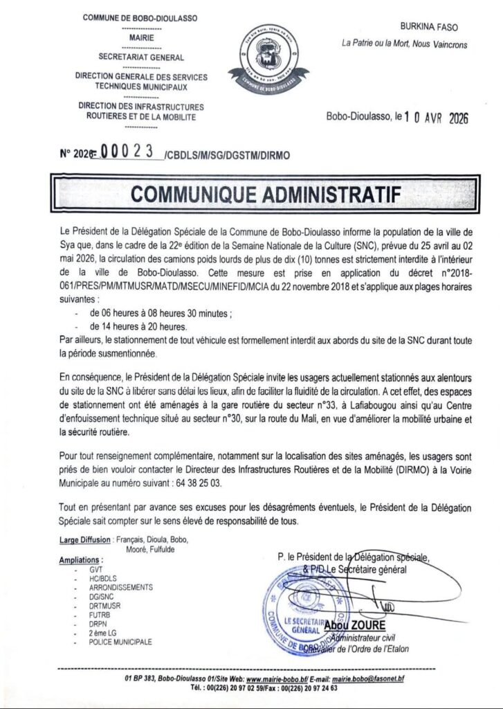 Dans le cadre de la 22e édition de la Semaine nationale de la Culture (SNC), prévue du 25 avril au 02 mai 2026, le Président de la Délégation spéciale de la commune de Bobo-Dioulasso annonce des mesures de régulation de la circulation.
