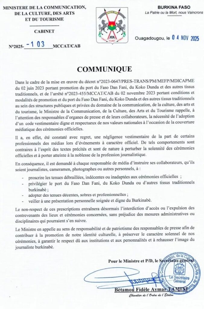 Désormais, il est exigé des journalistes, cameramen, photographes et autres collaborateurs des organes de presse « de proscrire les tenues indécentes ou inadaptées ; de privilégier le port de tenues traditionnelles burkinabè ; d’adopter des vêtements sobres, décents et professionnels ; de soigner leur présentation personnelle ».