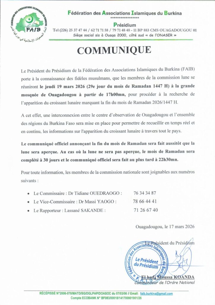 La Fédération des Associations Islamiques du Burkina (FAIB) a annoncé que l’observation du croissant lunaire marquant la fin du Ramadan 2026 aura lieu le jeudi 19 mars à la grande mosquée de Ouagadougou, à partir de 17h.