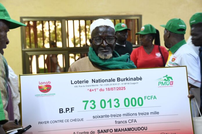 Avec une mise de 1200 Francs CFA au 4+1 du 18 juillet 2025, Mahamoudou Sanfo, cultivateur de 64 ans, a eu l’ordre des jeux du Pari mutuel urbain burkinabè (PMU’B) de la Loterie Nationale Burkinabè (LONAB). Il a reçu le chèque de son gain de 73 013 000 Francs CFA des mains du directeur général de l’institution, ce jeudi 31 juillet 2024 à Ouagadougou.