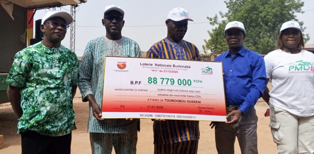 La Loterie Nationale Burkinabè (LONAB) a procédé, le samedi 17 janvier 2026 à Pô dans la province du Nahouri, région du Nazinon, à la remise officielle d’un chèque de 88 779 000 FCFA à un heureux gagnant au Pari Mutuel Urbain Burkinabè (PMU’B).