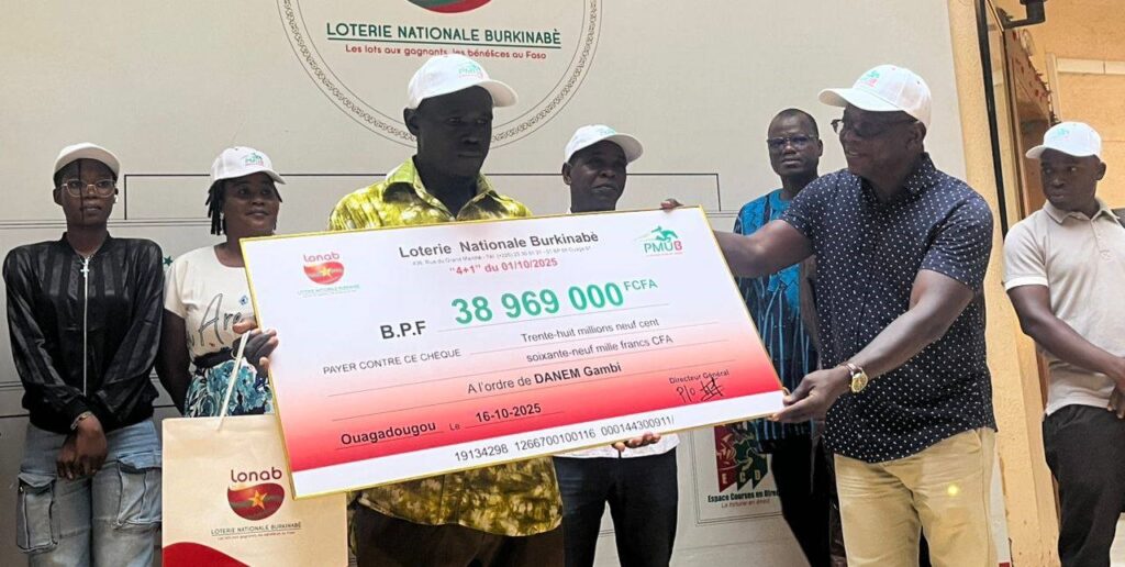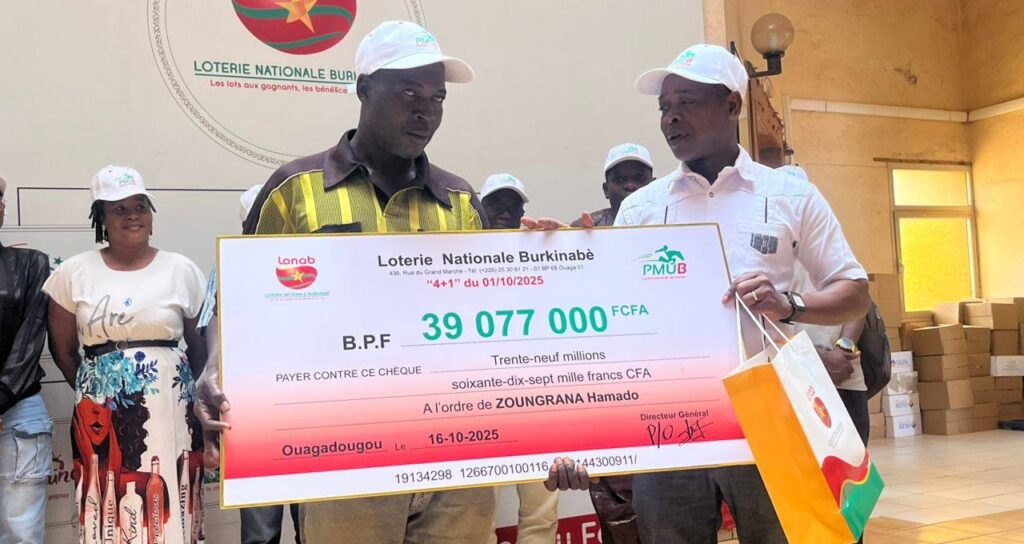 La Loterie Nationale Burkinabè (LONAB) a officiellement remis, ce jeudi 16 octobre 2025 à Ouagadougou, deux (02) chèques d’un montant cumulé de plus de 78 millions de francs CFA à deux (02) heureux gagnants d’un 4+1 du Pari Mutuel Urbain Burkinabè (PMU’B).