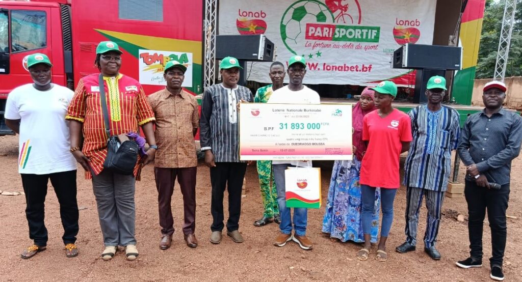 La Loterie Nationale Burkinabè (LONAB) a procédé, le dimanche 13 juillet 2025 à Téma Bokin dans la province du Passoré, région du Nord (Yadega) à la remise d’un chèque de près de 32 millions francs CFA à un heureux gagnant du Pari Mutuel Urbain Burkinabè (PMU’B).