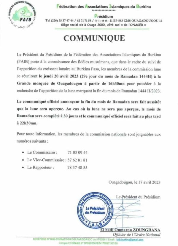 C’est la fédération des association islamiques du Burkina (FAIB) qui l’a signifié dans un communiqué. « Pour tout musulman qui viendrait à apercevoir le croissant lunaire au soir du dimanche 10 mars est prié d’informer l’imam de la mosquée de son quartier qui prendra attache avec la commission technique régionale », indique le communiqué.