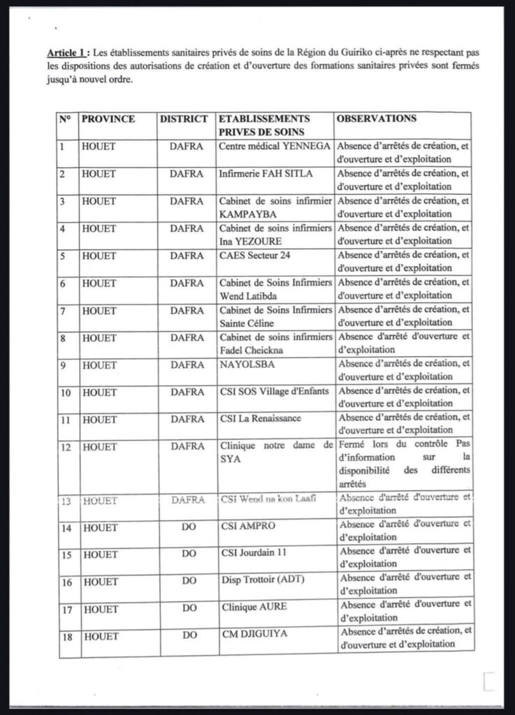Le gouverneur de la région du Guiriko, Mariama Konaté, a ordonné la fermeture de 38 centres de santé privés installés illégalement, à travers un arrêté pris à la suite de sorties de contrôle et d’inspection menées dans les établissements sanitaires de la région.
