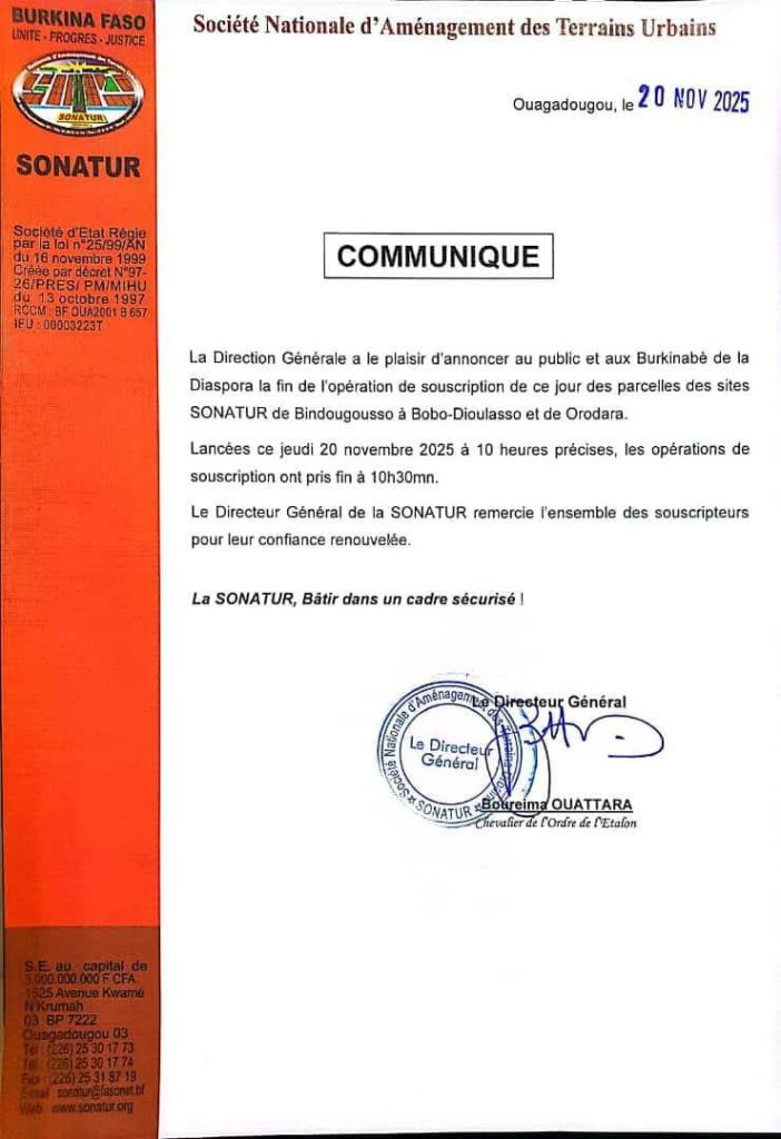 Aussitôt lancées, aussitôt clôturées. La SONATUR a annoncé ce jeudi 20 novembre 2025 la fermeture des souscriptions pour les parcelles des sites de Bindougousso (Bobo-Dioulasso) et d’Orodara.