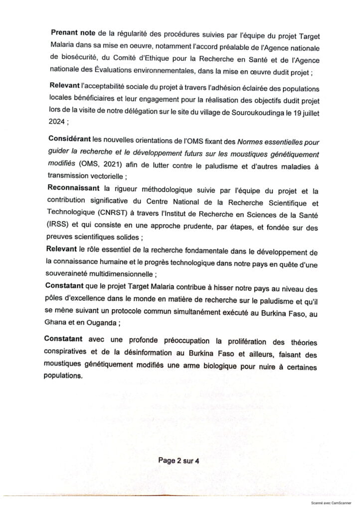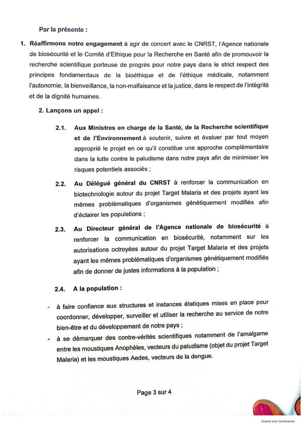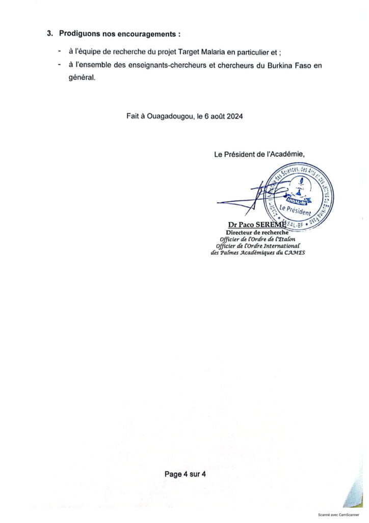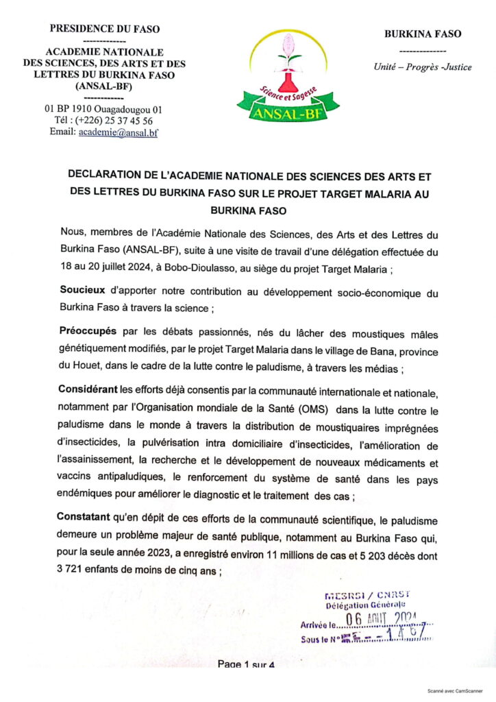 Dans une déclaration rendue publique ce 6 août 2024, l’Académie nationale des sciences, des arts et des lettres du Burkina Faso (ANSAL/BF) exhorte la population à faire confiance aux travaux du projet Target Malaria à qui, elle réitère son soutien.