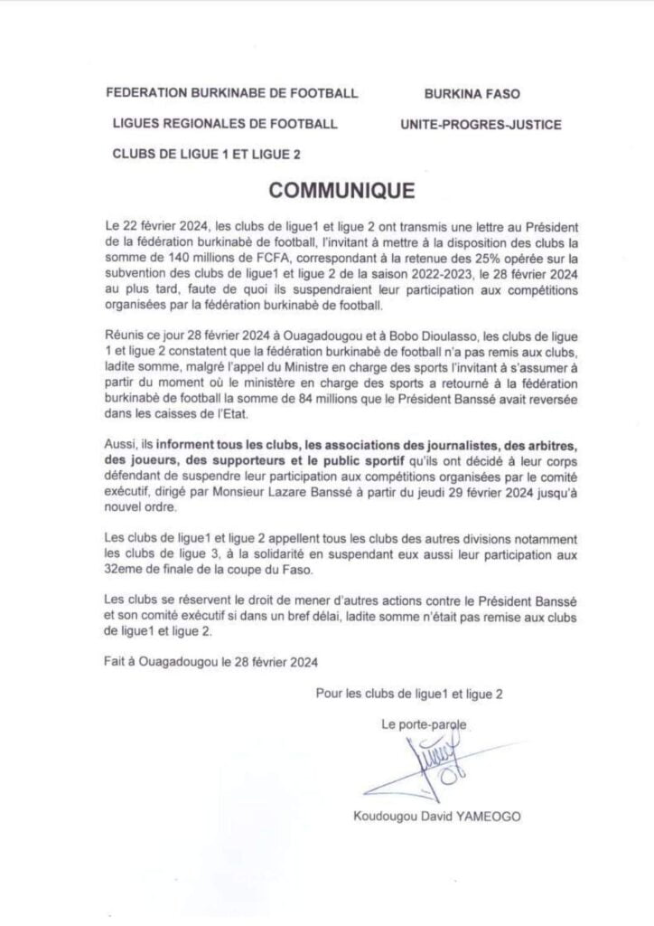 Le football burkinabè sera de nouveau à l’arrêt. Pour cause, les clubs dit frondeurs ont décidé ce jeudi 29 février 2024, à l’issue d’une rencontre à Ouagadougou et Bobo-Dioulasso, de ne plus participer aux compétitions organisées par la fédération burkinabè.