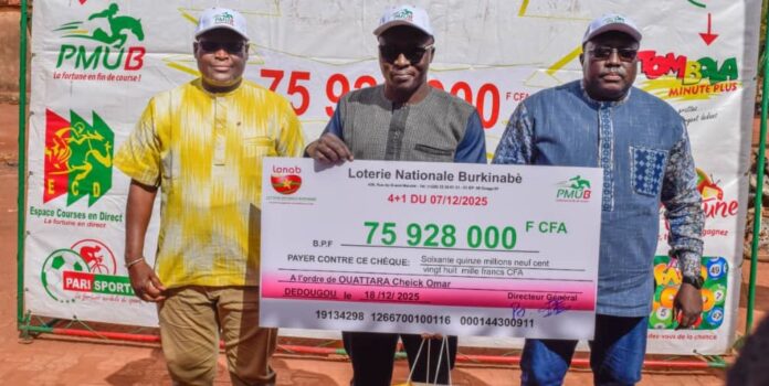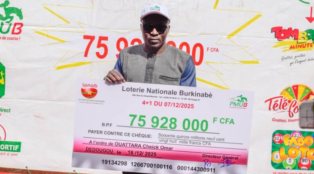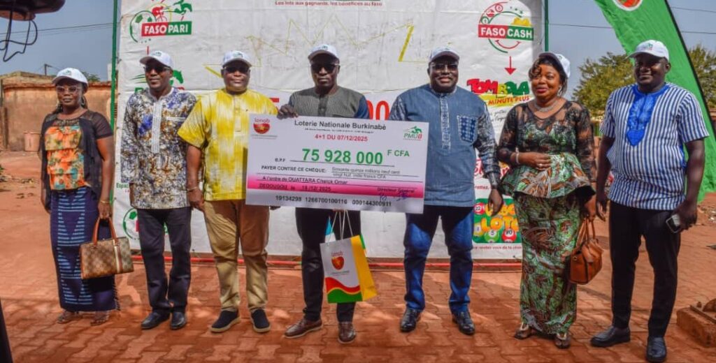 La Loterie Nationale Burkinabè (LONAB) a procédé, le mercredi 18 décembre 2025 à Dédougou, à la remise officielle d’un chèque de 75 928 000 FCFA au gagnant du 4+1 du dimanche 7 décembre 2025.