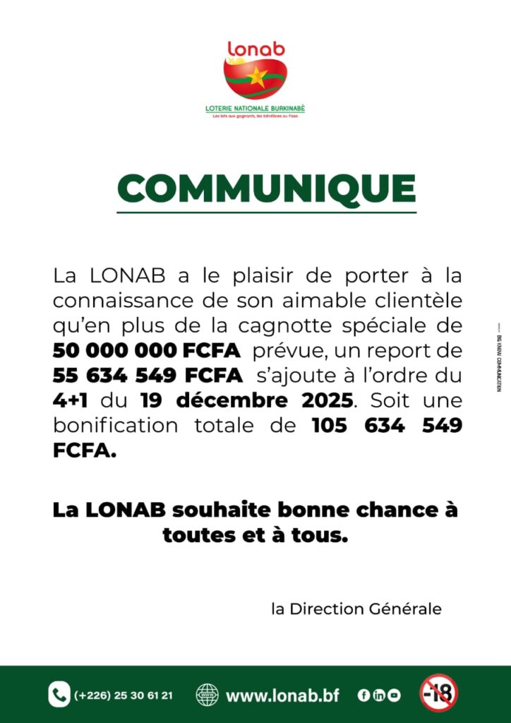 La LONAB a le plaisir de porter à la connaissance de son aimable clientèle qu’en plus de la cagnotte spéciale de 50 000 000 FCFA prévue, un report de 55 634 549 FCFA s’ajoute à l’ordre du 4+1 du 19 décembre 2025. Soit une bonification totale de 105 634 549 FCFA.