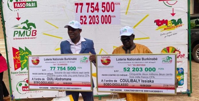 Deux (02) heureux gagnant du PMUB ont reçu leurs chèques d’un montant cumulé de plus de 129 millions FCFA ce vendredi 16 août 2024 à la direction régionale de l’Ouest de la loterie nationale Burkinabè (DRO/LONAB) sise à Bobo-Dioulasso.