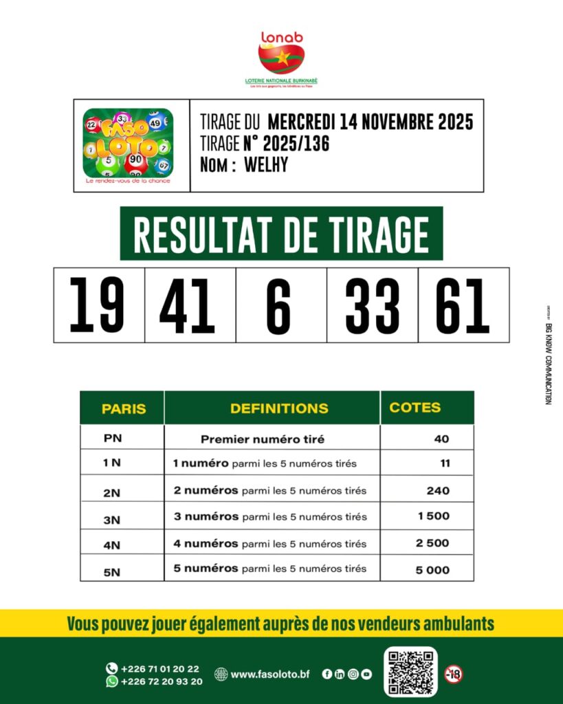 LONAB: Les résultats du tirage de Faso Loto du vendredi 14 novembre 2025