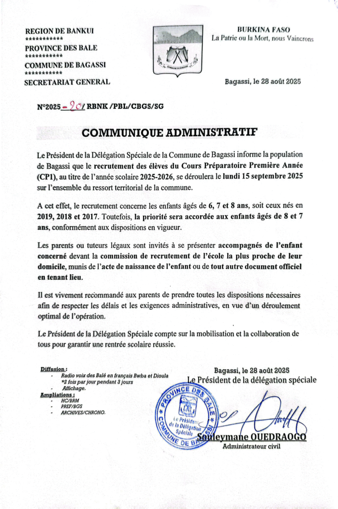 Dans la commune de Bagassi, le recrutement des élèves au CP1 pour la rentrée scolaire 2025/2026 aura lieu le lundi 15 septembre 2025. C’est le président de la délégation spéciale communale qui l’a annoncé dans le communiqué ci-après!