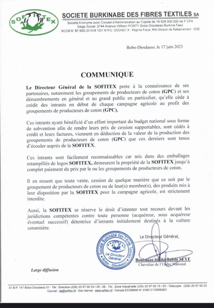 La Sofitex, dans le communiqué ci-après, met en garde, les personnes (producteurs de coton notamment) qui vendent l’engrais mis à leur disposition pour la production de l’or blanc.